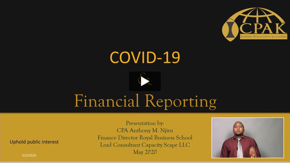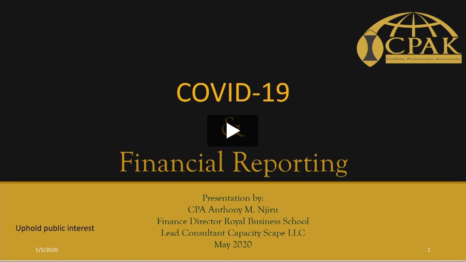 - COVID- 19 Pandemic has increased business uncertainty and is bound to influence both the way of financial reporting and the content in financial reports. The need for high-quality and reliable financial reports pervades despite the prevailing global circumstances. Paradoxically despite the growing need for guidance to financial reporters, the pandemic has reduced face to face interactions and CPD events. This online course is designed to provide the requisite continuous professional guidance to enhance reporting in this challenging period. The training provides an overview of reporting implications as a result of the pandemic. It lays a foundation for subsequent online training in specific IFRS and IPSAS in light of COVID -19 global pandemic.